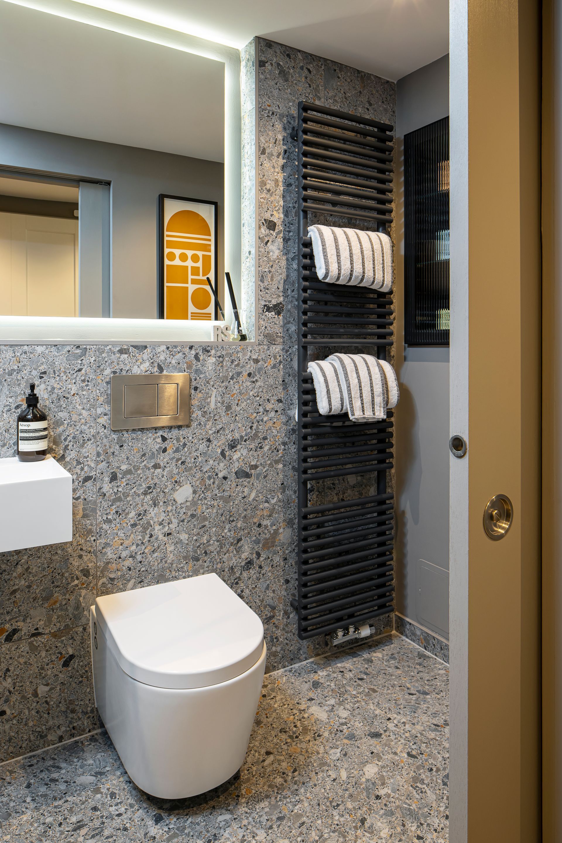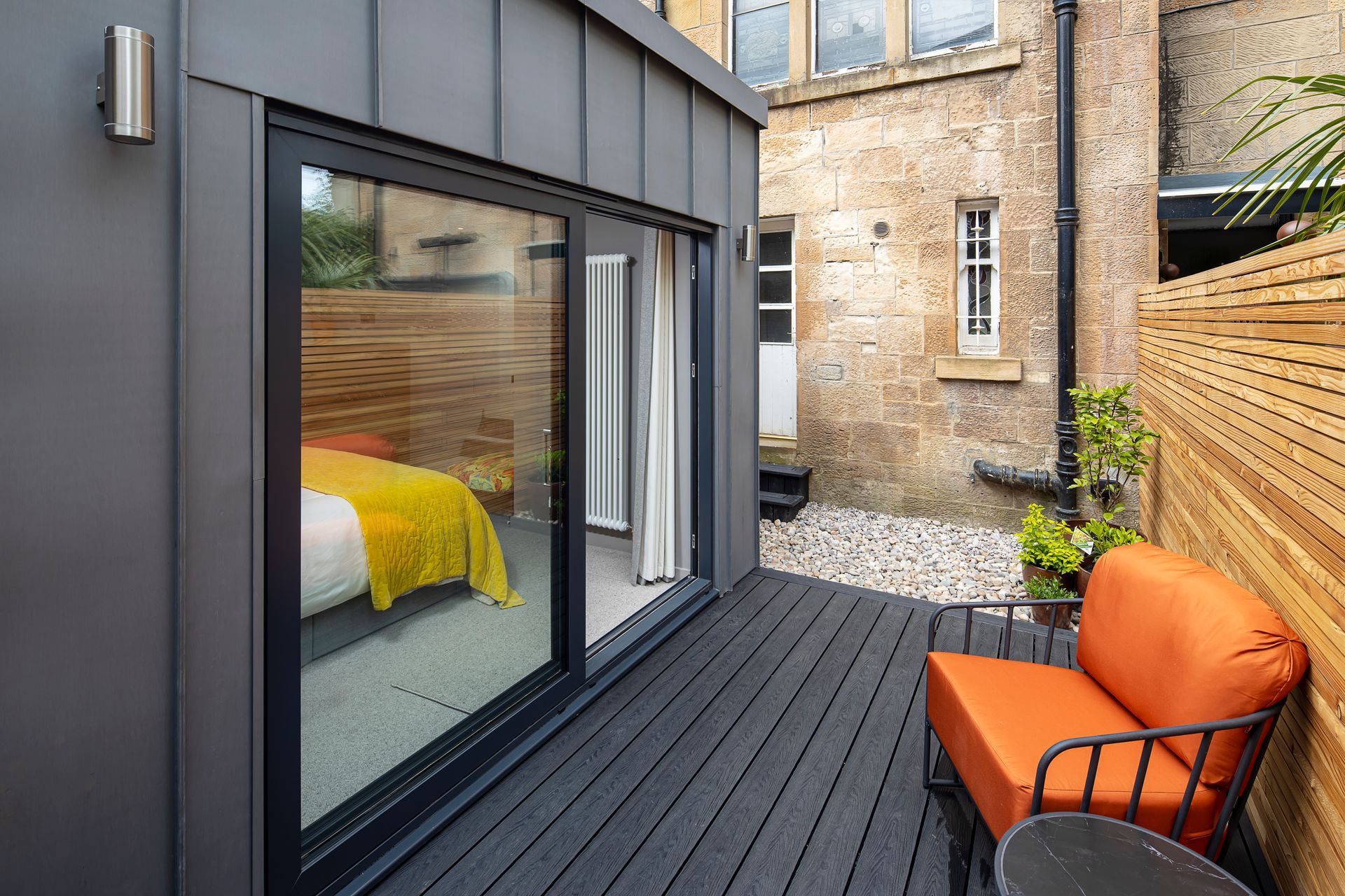 The bedroom is located at the rear of the extension, maximizing natural light and providing a direct connection to the garden. The hallway leading to the bedroom has been cleverly transformed into an ensuite and walk-through wardrobe, making efficient use of the available space. Thoughtfully positioned glazing allows for controlled privacy and light into the bedroom.