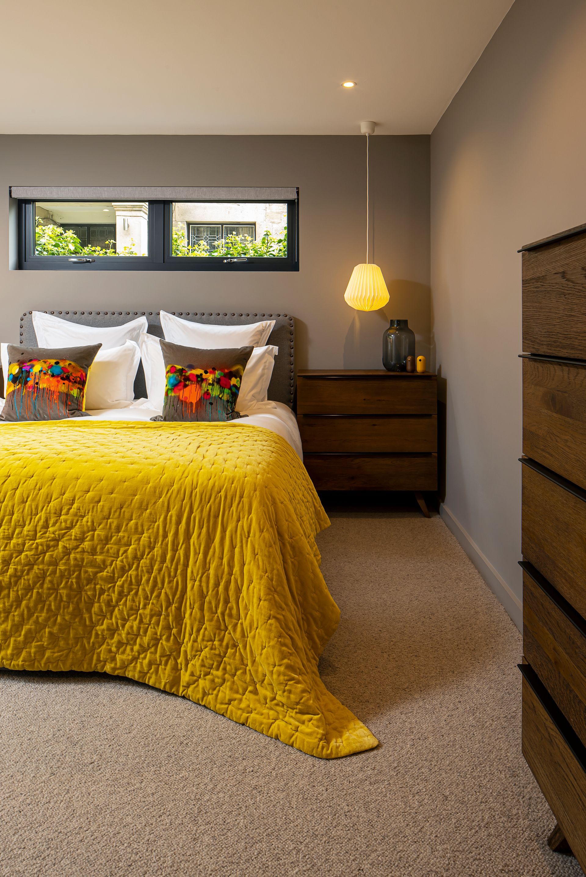 The bedroom is located at the rear of the extension, maximizing natural light and providing a direct connection to the garden. The hallway leading to the bedroom has been cleverly transformed into an ensuite and walk-through wardrobe, making efficient use of the available space. Thoughtfully positioned glazing allows for controlled privacy and light into the bedroom.