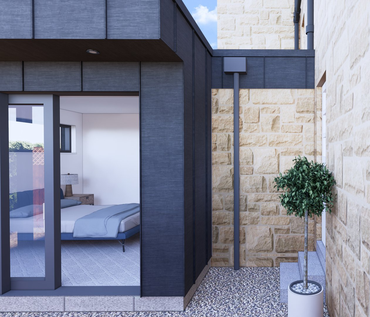 The zinc clad extension will replace a former conservatory, creating a luxurious new master suite. A green roof will bring biodiversity to the sheltered site, with new sliding doors connecting the space to the courtyard garden.